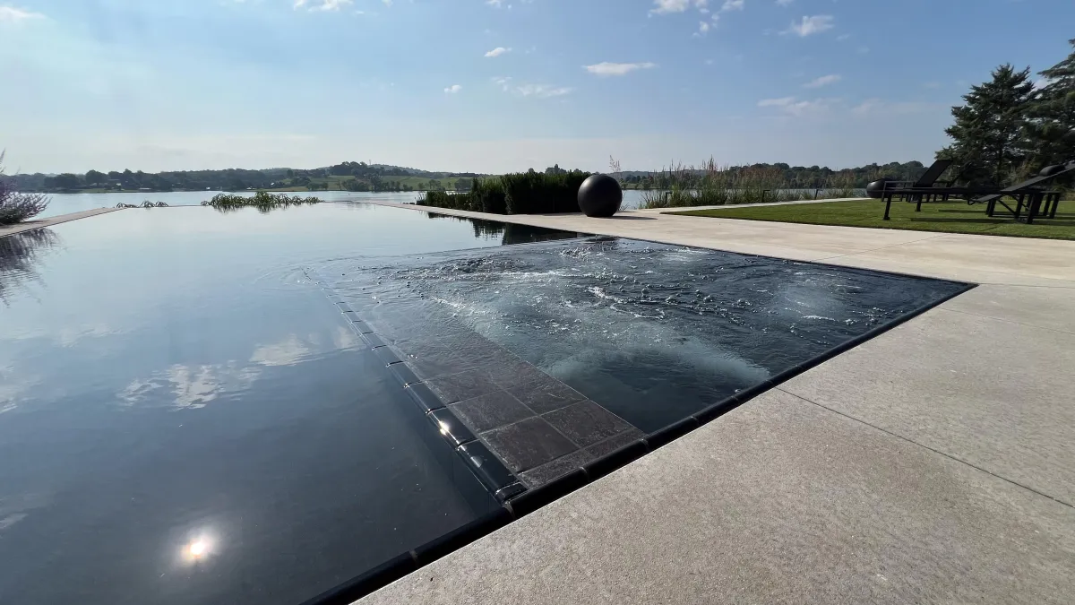 perimeter overflow/knife-edge spa - water flows evenly over all edges, producing a mirror-surface look and refined minimalism.